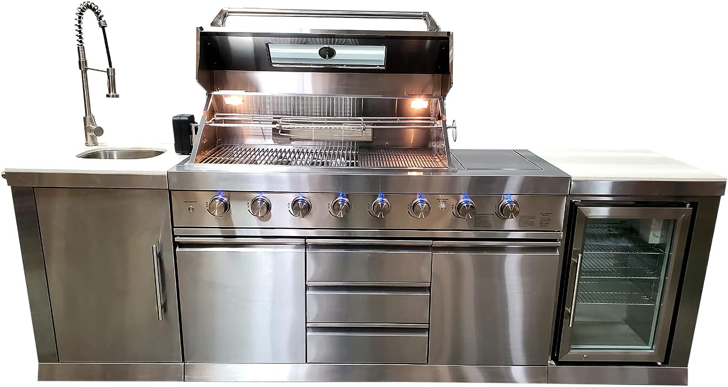 2 Modular Piece Black Stainless Steel 6 Burner Marble Top BBQ Outdoor Electric Propane Grill Kitchen with Refrigerator, Sink, Side Burner, LED Lights on Knobs, & Protective Cover